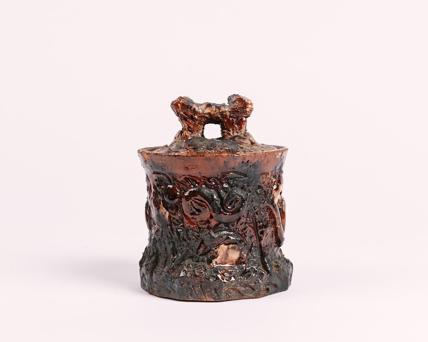 K71 Ceramic tobacco jar in experimental glaze, flora and fauna decoration, made in Sevenoaks Weald, 1800s