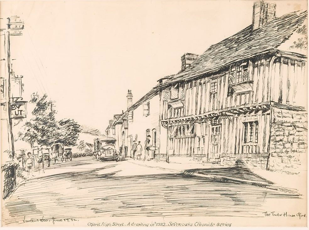 Drawing of Otford High Street by Vincent New for the Sevenoaks Chronicle (1932), © Kent County Council Sevenoaks Museum