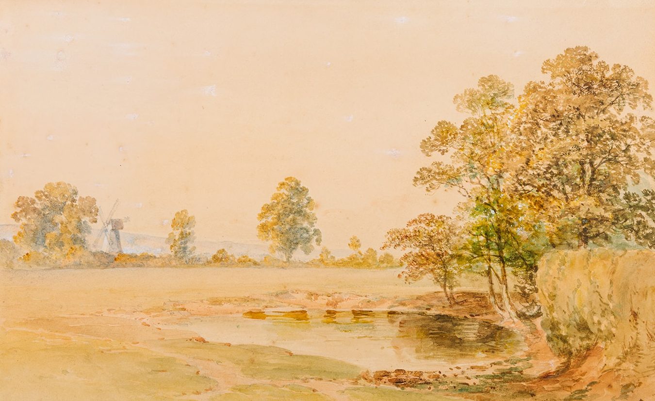 K1636 Watercolour of Knott's windmill and pond by William Knight, 1800s