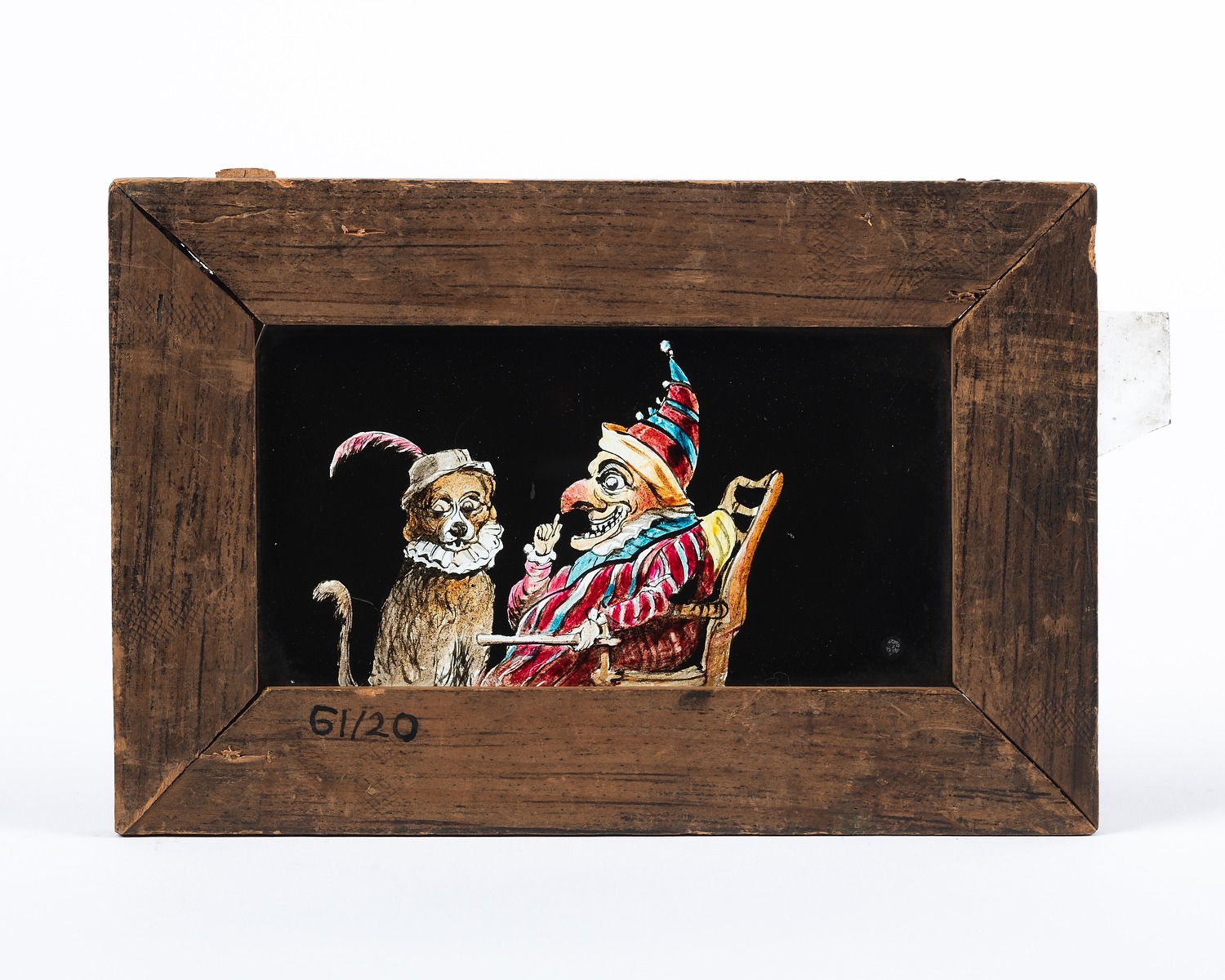 K61.20 Hand painted glass magic lantern slide depicting Mr Punch and his dog Toby, c.1840